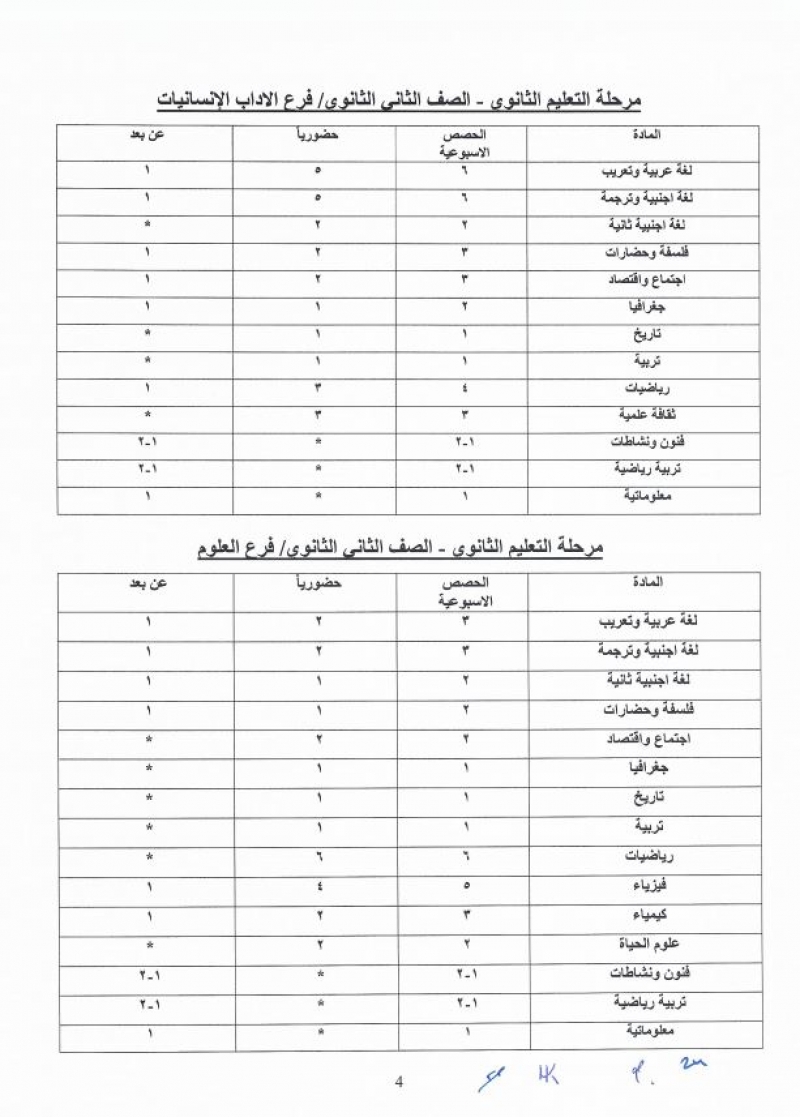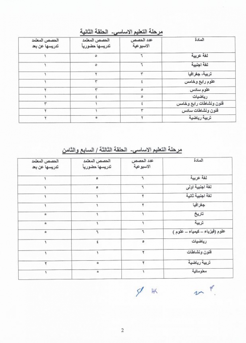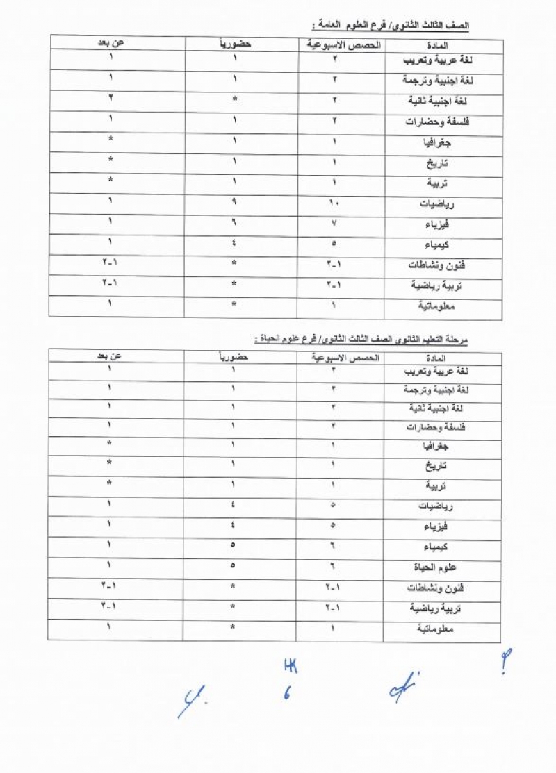 وطلب الوزير المجذوب بموجب القرار من جميع المسؤولين عن الثانويات والمدارس الرسمية "التقيد بجدول توزيع ساعات التدريس الحضوري والتعلم عن بعد، لكافة مراحل التعليم الأساسي والثانوي وفقا للأتي :