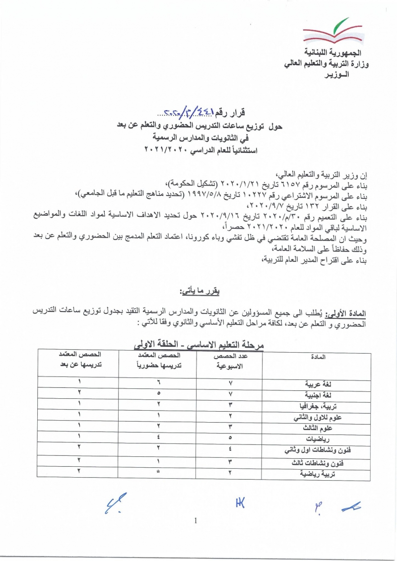أصدر وزير التربية في حكومة تصريف الأعمال "طارق المجذوب" قرار رقم 441م حول توزيع ساعات التدريس الحضوري والتعلم عن بعد في الثانويات والمدارس الرسمية استثنائياً للعام الدراسي 2020-2021.