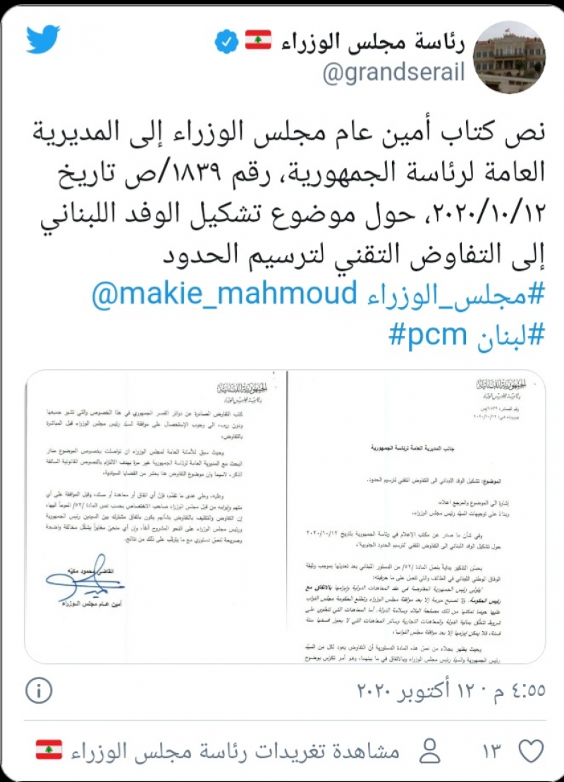 وجه امين عام مجلس الوزراء محمود مكية كتابا الى المديرية العامة لرئاسة الجمهورية يتعلق بتشكيل الوفد اللبناني الى التفاوض التقني لترسيم الحدود.