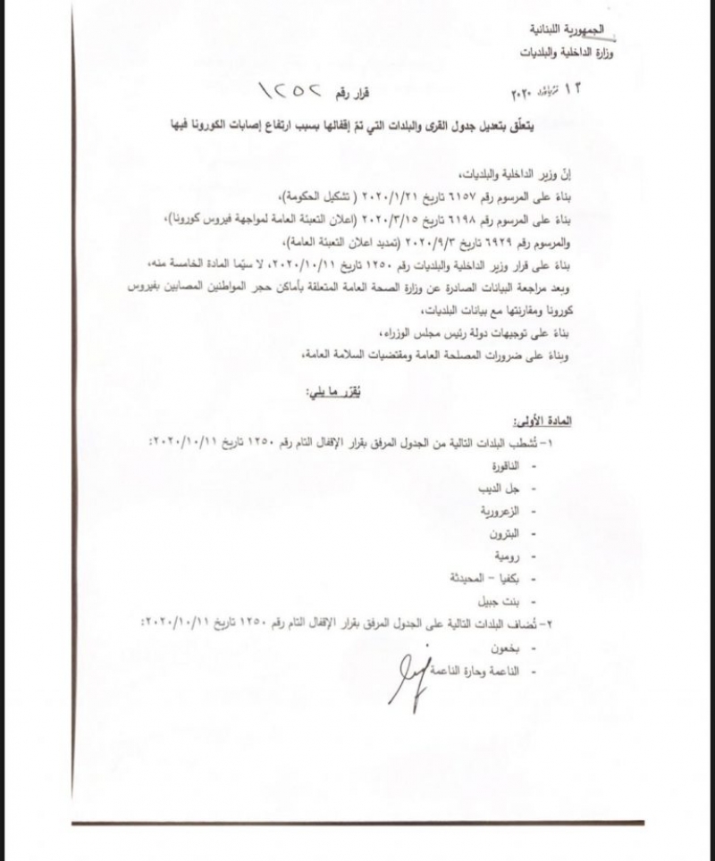 أصدرت وزارة الداخلية والبلديات، قرار 1252 يتعلّق بتعديل جدول القرى والبلدات التي تم إقفالها بسبب إرتفاع إصابات كورونا فيها.
