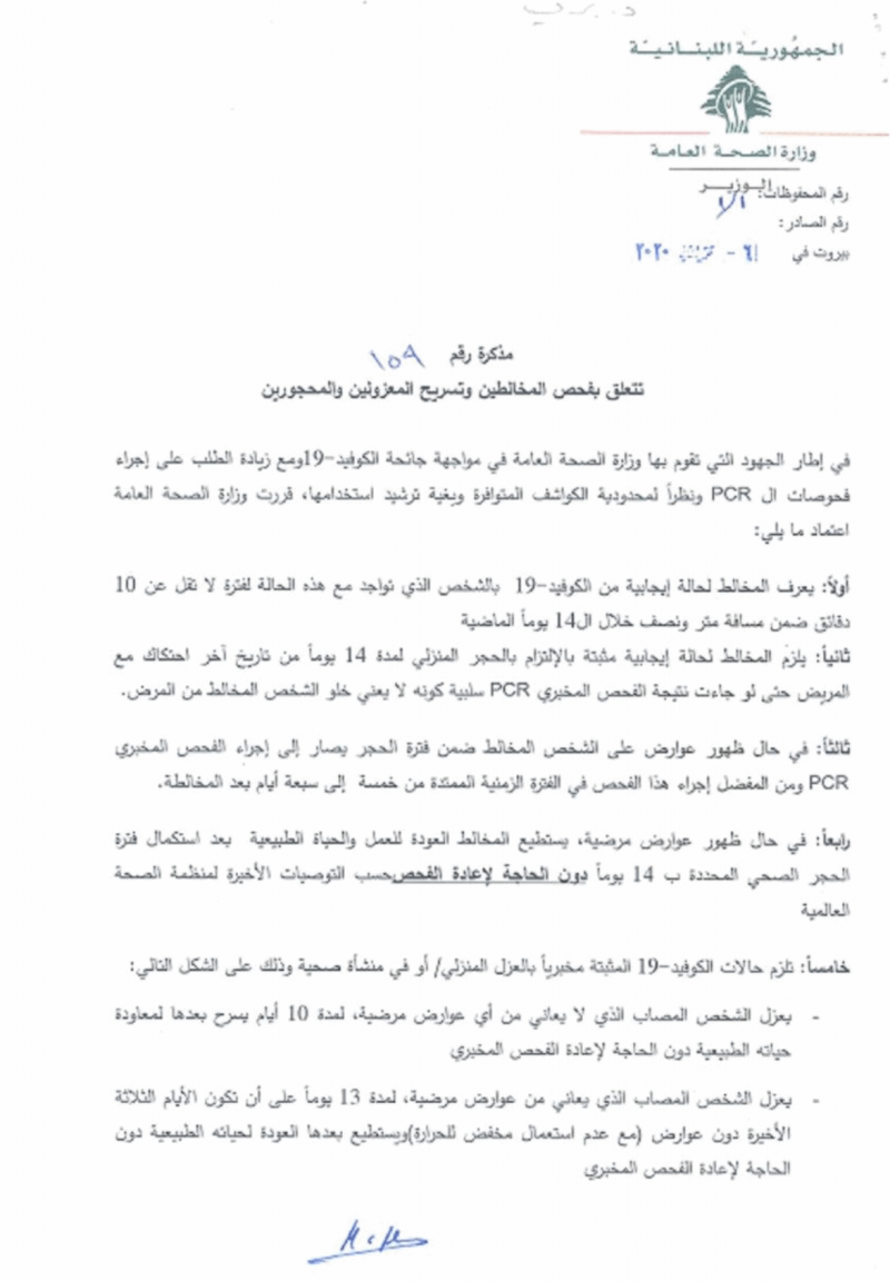 أصدر "وزير الصحة" في حكومة تصريف الأعمال حمد حسن مذكرة تتعلق بفحص المخالطين وتسريح المعزولين والمحجورين.