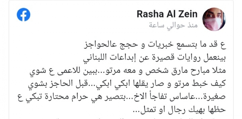 وفي هذا النطاق، كتبت الاعلامية رشا الزين عبر حسابها على فيسبوك قائلة: "ع قد ما بتسمع خبريات و حجج عالحواجز بينعمل روايات قصيرة عن إبداعات اللبناني مثلا مبارح مارق شخص و معه مرتو...ببين للاعمى ع شوي كيف خبط مرتو و صار يقلها ابكي ابكي...قبل الحاجز بشوي صغيرة...عاساس تفاجأ الاخ...بتصير هي حرام محتارة تبكي ع حظها بهيك رجال او تمثل...بيوقفوا عالحاجز...بقلووو شو الوضع لوين بس؟ رقم مفرد و بلا كمامات...و اي الولاد ورا بحالة صدمة..واحد ماسك كيس تشبس وقت خبط بيو امو علقت التشيبساي بتمو و فتحوا...المهم بقلووو عالمستشفى مدري شو بهااا عوارض كورونا و هي حامل...بيضحك اللي عالحاجز و بقلووو انت بس بهالنقطة هون رقم ٧ اللي مش عارفة مرتوو تعيش الدور عاليمين صف و ٥٠ الف غرامة. هيدا غير اللي رايح عالمطار و هو شو جاي من ميلة بيروت يعني خط الاولي باتجاه صيدا و لا معه شنط و لا شي...بقلو لوين؟؟؟ قال عندي طيارة و ماخر دخيلك...قال طيب حنتغاضى ع اتجاهك حاليا وين التيكيت؟؟؟ الجواب التقليدي المستهلك....مين بعد بيمسك تكت هههه كلو عالسيستم هونيك ف قد ما مهضوم اللي عالحاجز او مارق عليه هيك مساطر بقلوو هههه و وين و التيكيت اللي اتبعتت ع تلفونك الذكي اكثر منك".