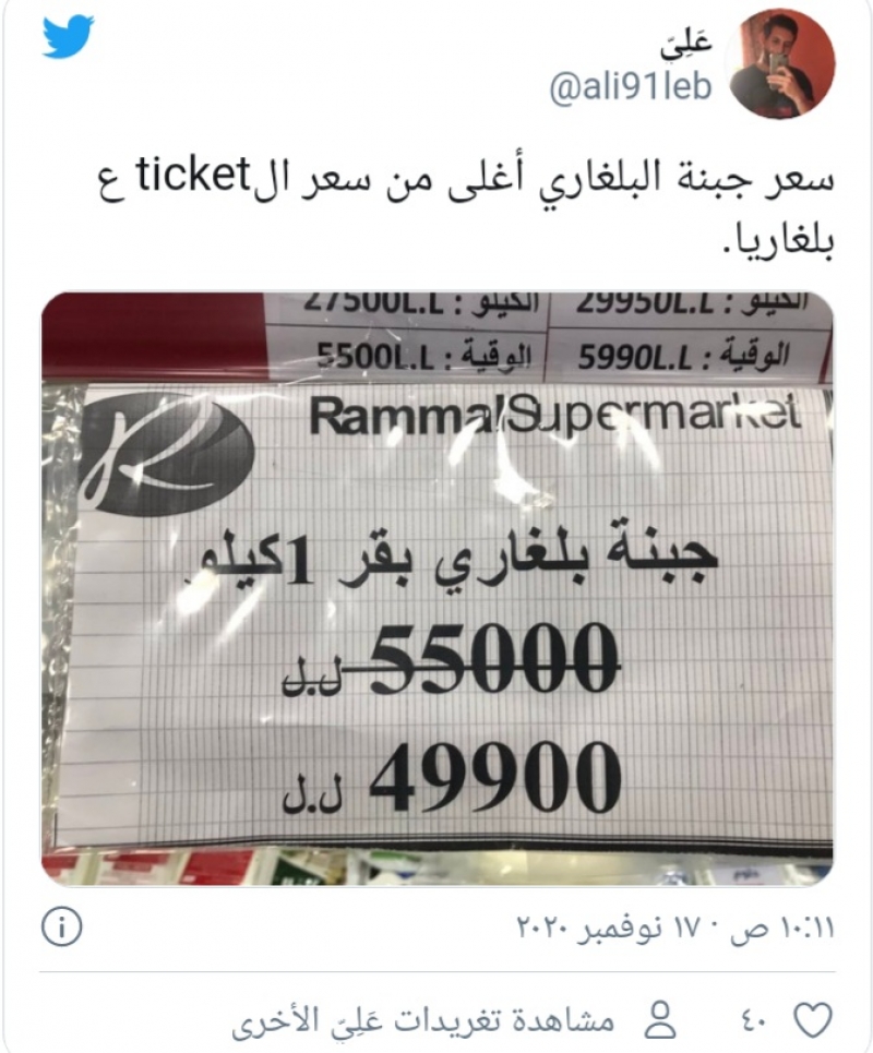 انتشر عبر مواقع التواصل الاجتماعي صورة من احدى السوبر ماركت لعرض على الجبنة من نوع البلغاري حيث عرض الكيلو بـ 49900 بعد ان كان 55000 ألف ليرة لبنانية. وعلق ناشطون بالقول: "سعر جبنة البلغاري أغلى من سعر الticket ع بلغاريا".
