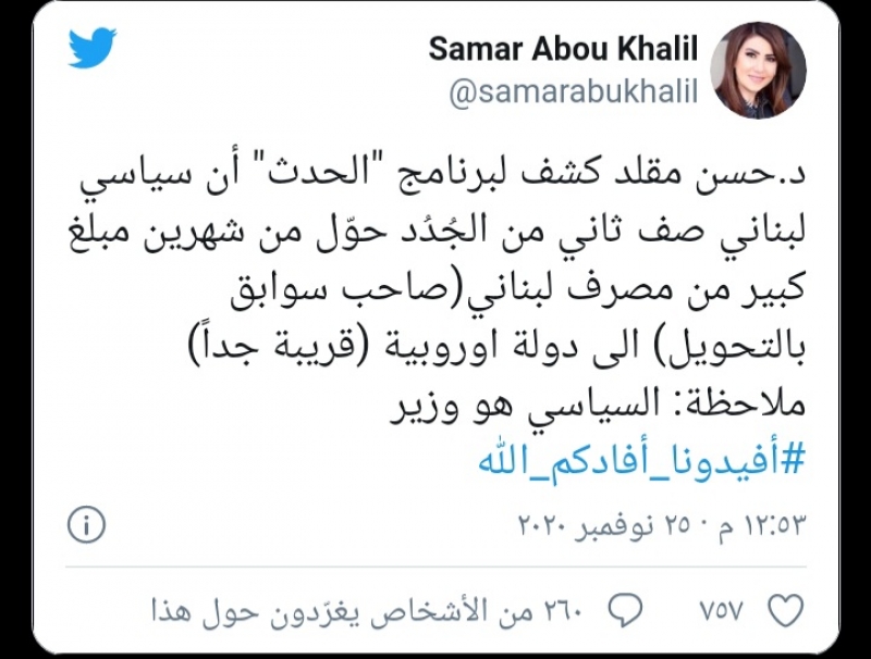 كشف رئيس تحرير مجلة الاعمار والاقتصاد الخبير الاقتصادي د.حسن مقلد لبرنامج "الحدث" أن سياسي لبناني صف ثاني من الجُدُد حوّل من شهرين مبلغ كبير من مصرف لبناني(صاحب سوابق بالتحويل) الى دولة اوروبية (قريبة جداً).