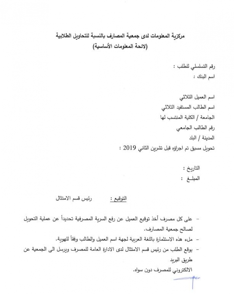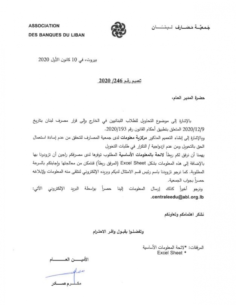 أصدرت جمعية المصارف تعميماً يتعلق بالتحاويل للطلاب اللبنانيين إلى الخارج، على أن يتم إرفاق المعلومات الآتية مع الطلب: