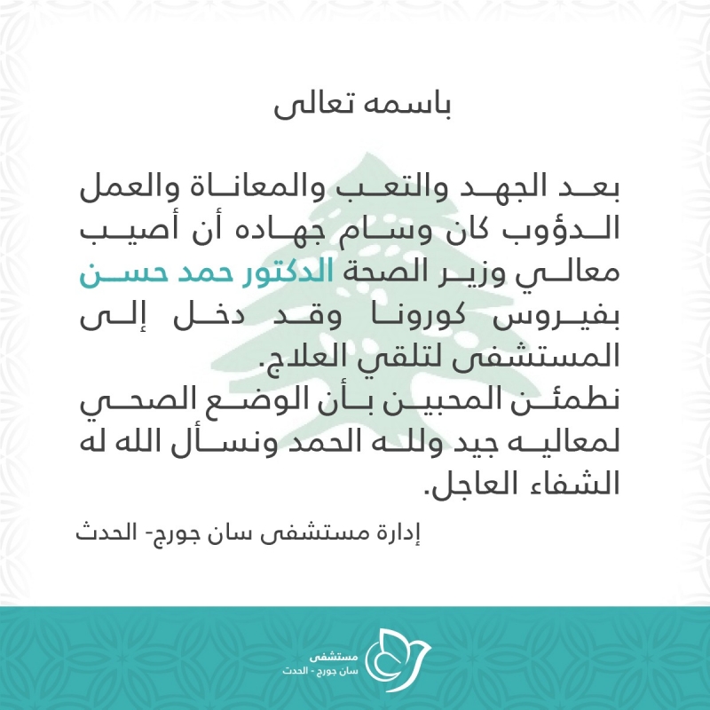اصيب وزير الصحة د حمد حسن بفيروس كورونا وفق ما افادت مصادر طبية. بالشفاء العاجل للوزير وجميع المصابين....