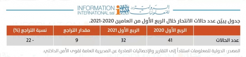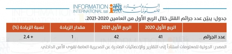 وأكّد تقرير "الدولية للمعلومات" أنّ "جرائم القتل شبه استقرار خلال الفترة المذكورة سابقاً، فزاد عدد جرائم القتل جريمة واحدة فقط أي زيادة بنسبة 2.4%".