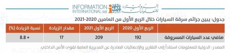 وأفاد التقرير الصادر عن "الدولية للمعلومات" أنّ نسب سرقة السيارات سجّلت ارتفاعاً في الربع الأوّل من العام 2021 مقارنة بالفترة ذاتها من العام 2020 بلغ نسبة 8.8% وفقاً للجدول التالي:
