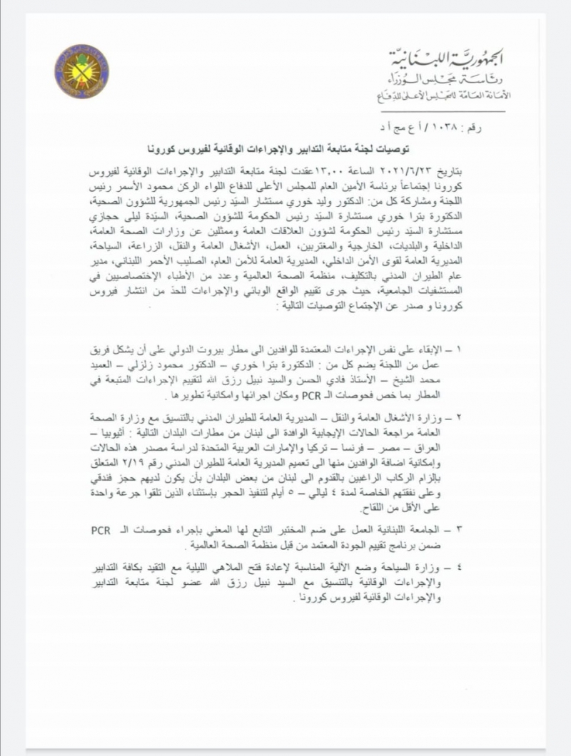 أصدرت لجنة متابعة التدابير والاجراءات الوقائية لفيروس كورونا مجموعة توصيات ابرزها متمثل في تعديل توقيت اغلاق المطاعم ليصبح حتى الساعة الواحدة والنصف من بعد منتصف الليل.