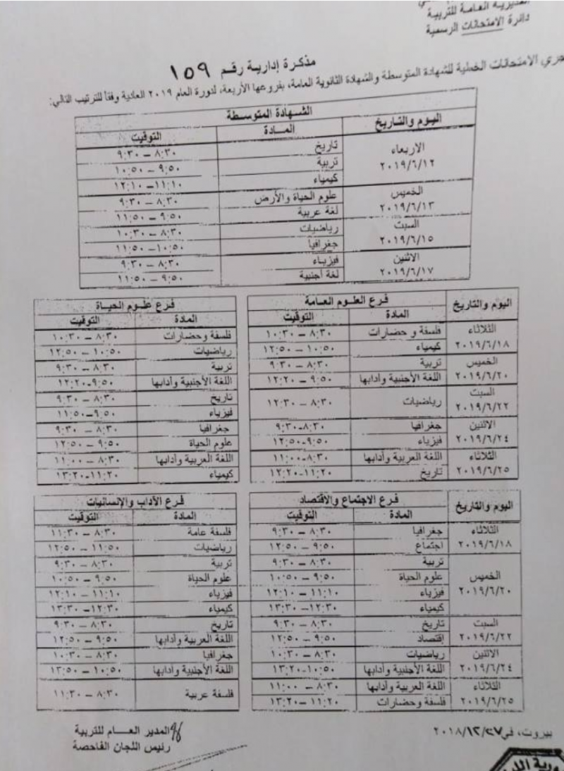 جدول مواعيد الامتحانات الرسمية للشهادة المتوسطة والشهادة الثانوية العامة بفروعها الأربعة.