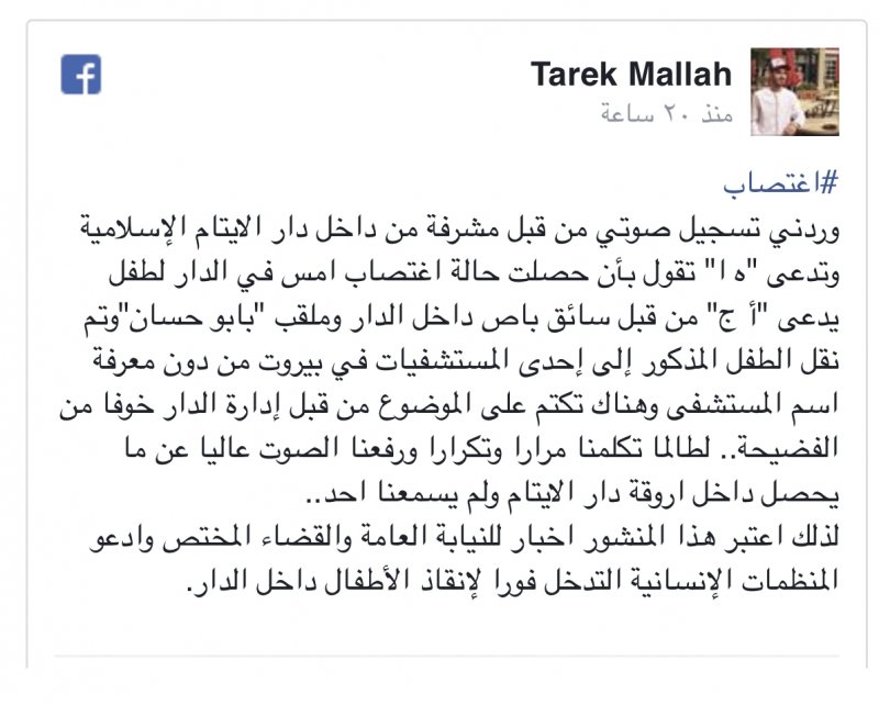 وردتني معلومات من قبل مشرفة من داخل دار الايتام الإسلامية واسمها تقول بأن حصلت حالة اغتصاب امس في الدار لطفل من قبل سائق باص داخل الدار وتم نقل الطفل المذكور إلى إحدى المستشفيات في بيروت من دون معرفة اسم المستشفى وهناك تكتم على الموضوع من قبل إدارة الدار خوفا من الفضيحة.. لطالما تكلمنا مرارا وتكرارا ورفعنا الصوت عاليا عن ما يحصل داخل اروقة دار الايتام ولم يسمعنا احد..