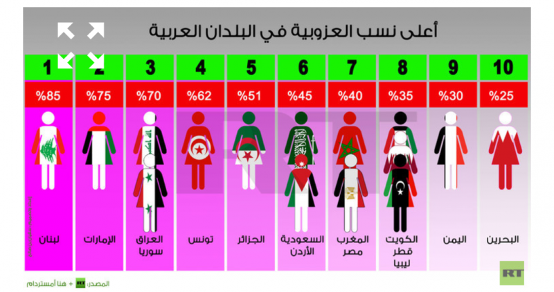 ويأتي لبنان في المقدمة بين الدول العربية حيث بلغ معدل العنوسة 85% حسب آخر الدراسات، وتلته الإمارات بنسبة 75%، ومن ثم كل من سوريا والعراق بنسبة 70%.