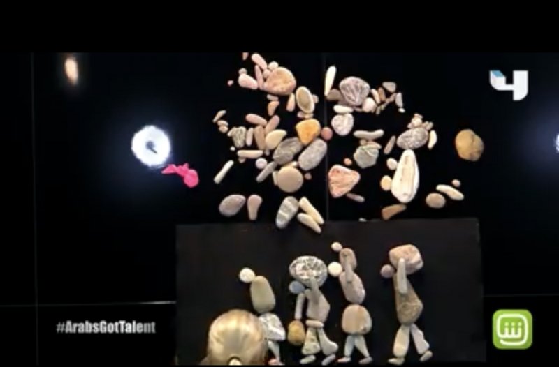 أبهر المتسابق السوري نزار علي بدر (54 عاماً) لجنة تحكيم برنامج “آرابز غات تالنت” والمشاهدين برسم أزمة النزوح السوري ومعاناة السوريين بأحجاره، حيث ظهر في الصورة مجموعة من السوريين وهم يحملون أمتعتهم وأولادهم على أكتافهم ويغادرون.