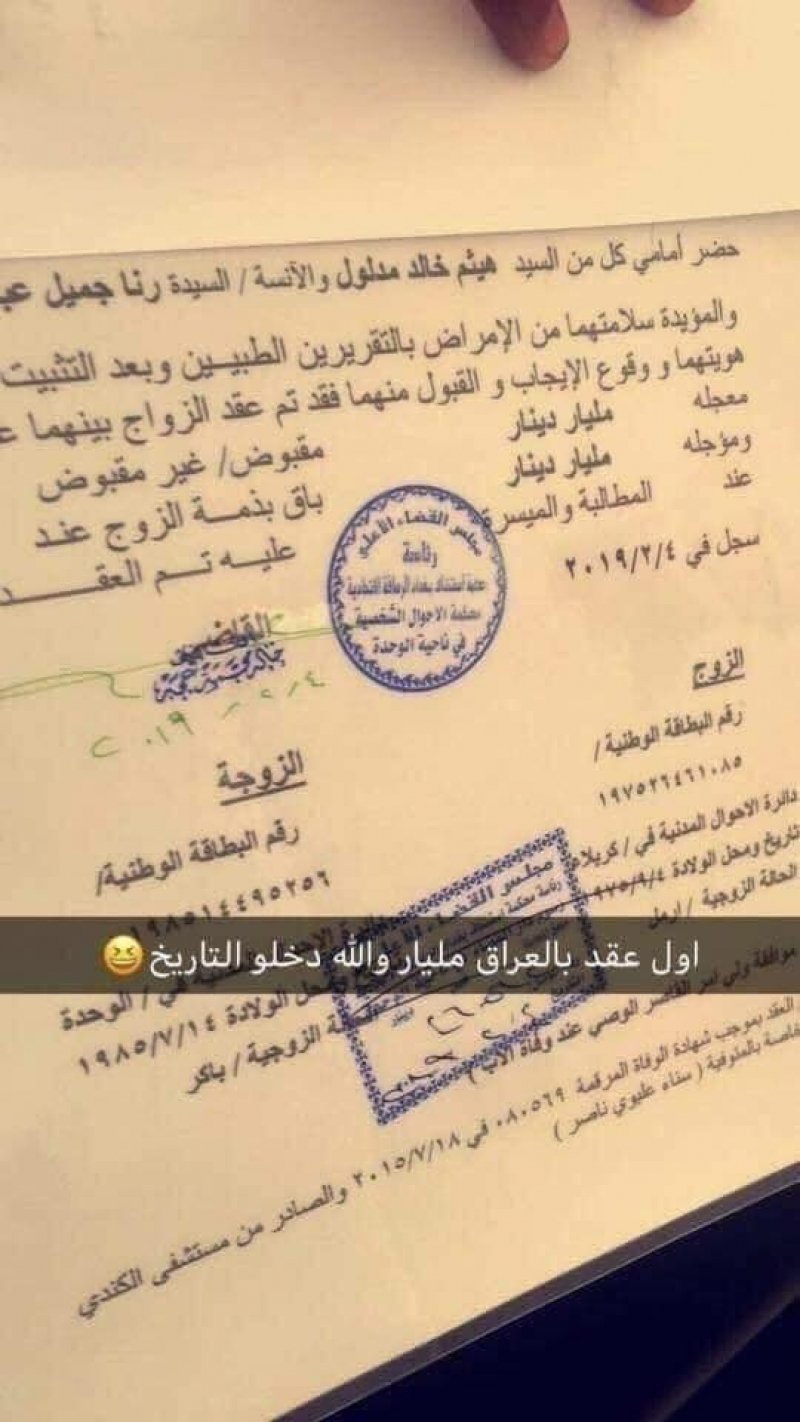 وفي التفاصيل أنّ العروس رنا جميل سجلت اسمها في التاريخ كصاحبة أعلى مهر في العراق الذي بلغ ملياري دينار عراقي (1.7 مليون دولار)؛ علماً أنّ العقد وثّق في محكمة عراقية في محافظة كربلاء.