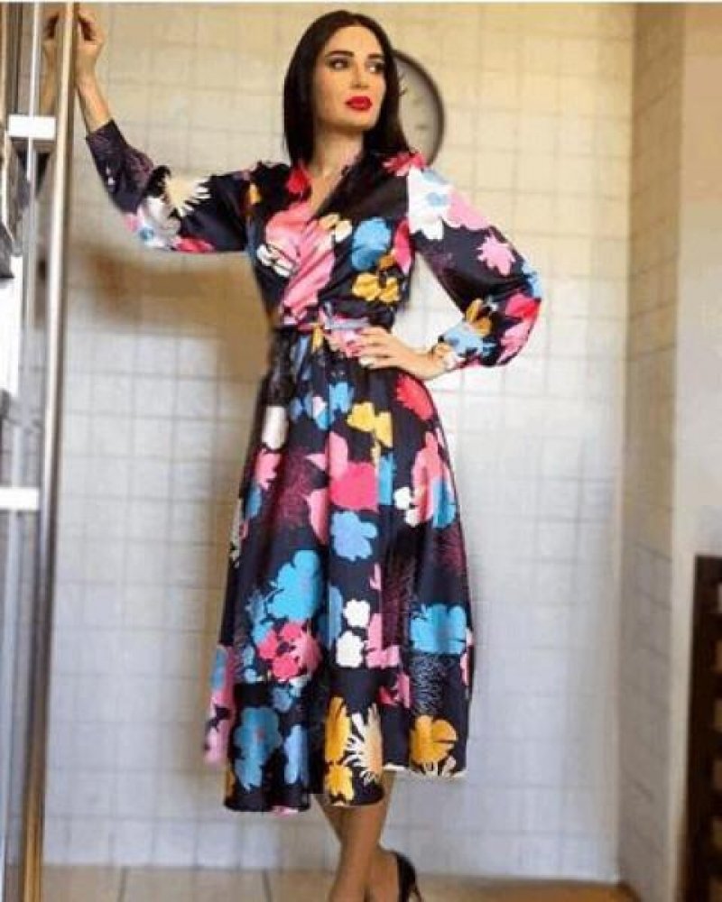 وأطلت سيرين أيضا بفستان بطبعات الورود والزهور الملوّنة نسّقته مع حذاء الكعب العالي باللون الأسود اللامع.