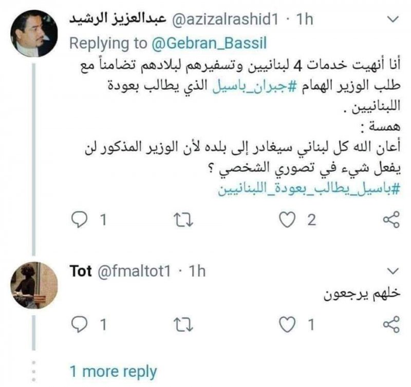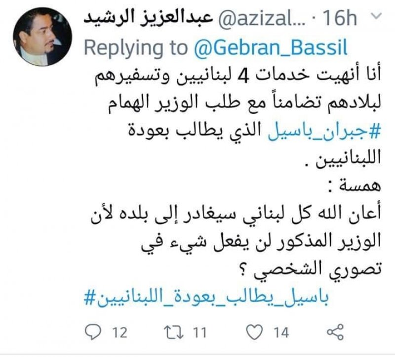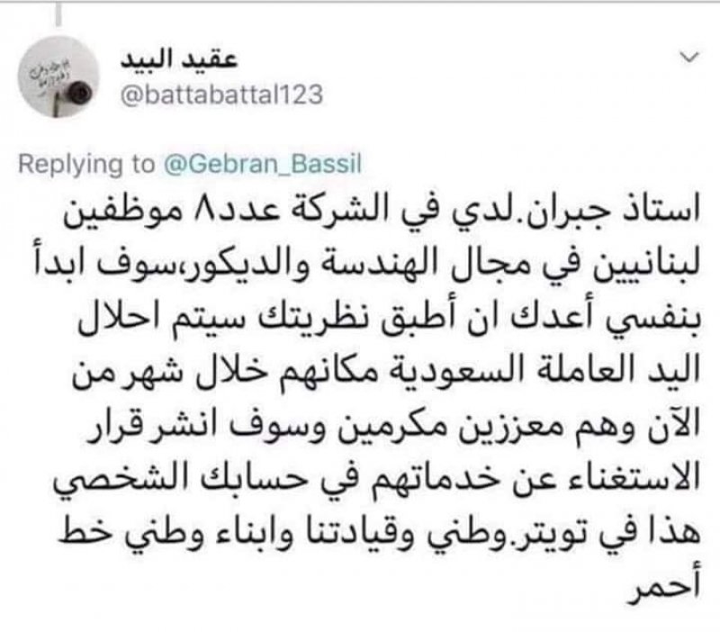 طرد صاحب احدى الشركات السعودية وتدعى “مجموعة الرشيد” 4 موظفين لبنانيين في رد على تغريدة باسيل: “أنا أنهيت خدمات 4 لبنانيين وتسفيرهم لبلادهم تضامناً مع طلب الوزير الهمام #جبران_باسيل الذي يطالب بعودة اللبنانيين.”