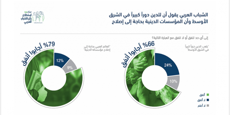 توازياً، كشفت نتائج استطلاع “أصداء بي سي دبليو السنوي الحادي عشر لرأي الشباب العربي” التي نُشرت في 1 أيار من العام الجاري، أنّ 2 من أصل كل 3 مشاركين (66%) قالوا إن للدين في المنطقة دوراً مبالغاً فيه– بزيادة نسبتها 16% منذ استطلاع عام 2015– في حين قالت نسبة 79% من الشباب العربي إن المنطقة تحتاج إلى إصلاح مؤسساتها الدينية.