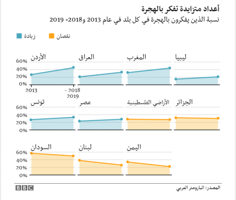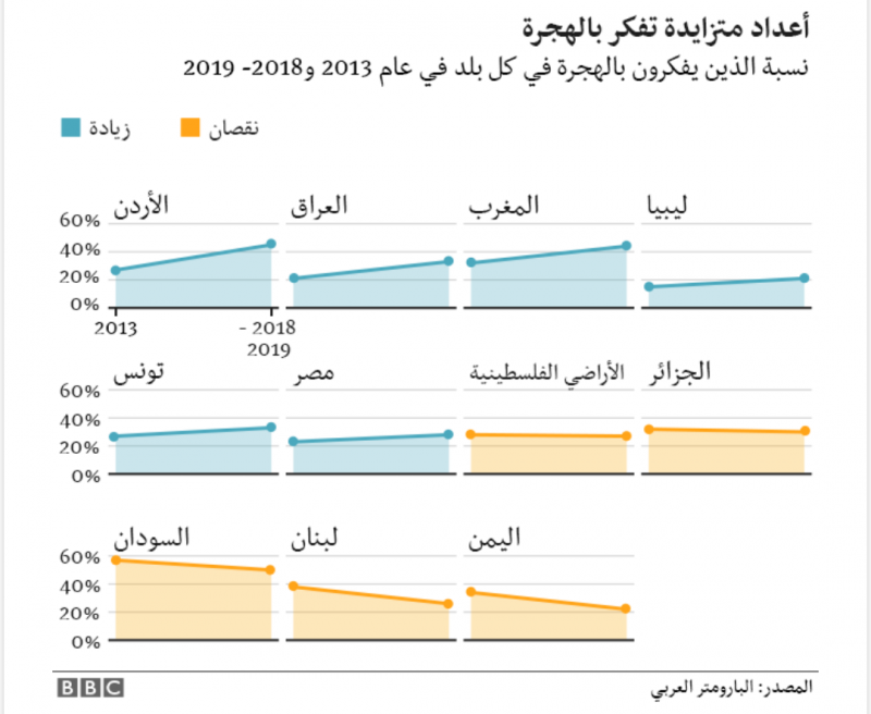 وقد شهد الأردن أكبر زيادة في هذا المجال، إذ ارتفعت نسبة الراغبين في الهجرة هناك من الربع في عام 2013 إلى النصف تقريبا اليوم. وشهد لبنان واليمن أكبر انخفاض في عدد الراغبين في الهجرة.
