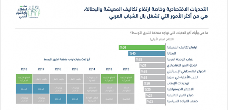 وفي السياق نفسه، بيّن استطلاع “أصداء بي سي دبليو السنوي الحادي عشر لرأي الشباب العربي” أنّ نسبة 56% من الشباب اعتبروا أنّ ارتفاع كلفة المعيشة يمثّل مصدر القلق الأول بالنسبة إليهم، في حين اعتبرت نسبة 45% من الشباب أنّ البطالة تمثّل مصدر القلق الأول.