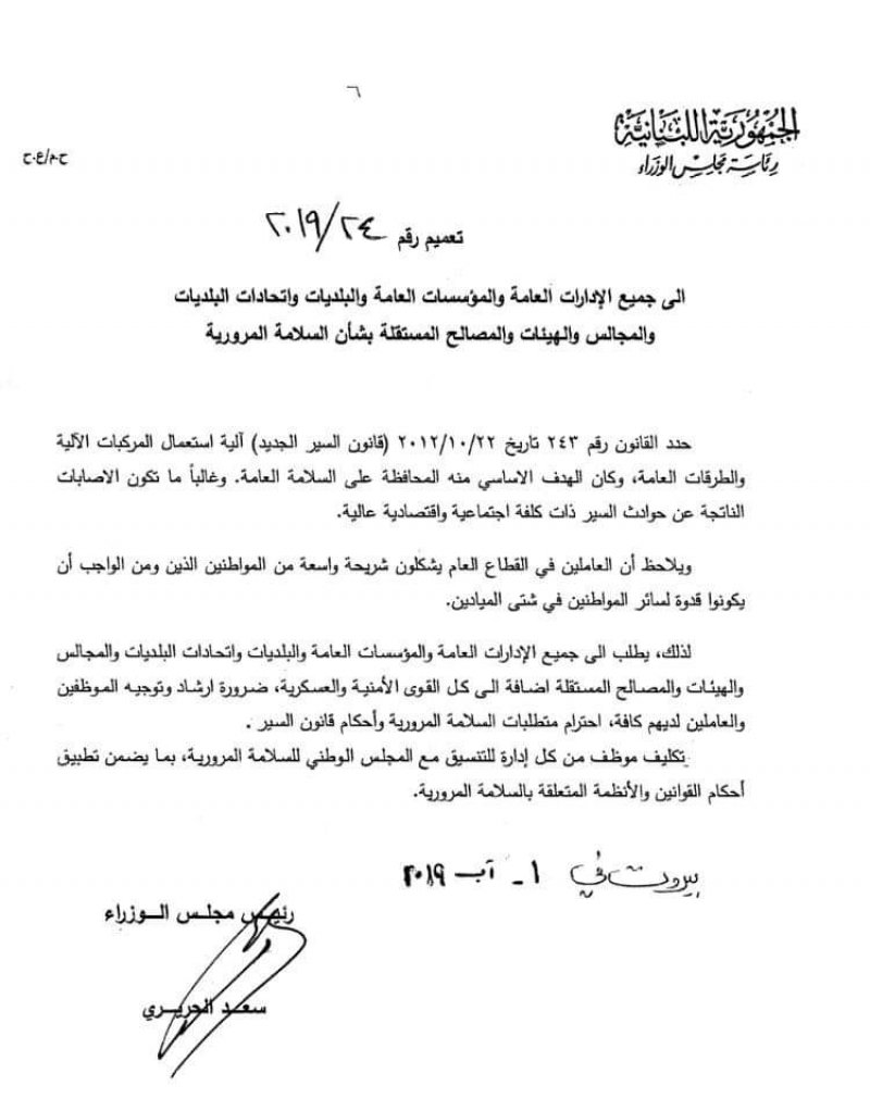 أصدرت رئاسة مجلس الوزراء تعميماً الى جميع الادارات العامة والمؤسسات العامة والبلديات واتحادات البلديات والمجالس والهيئات والمصالح المستقلة اضافة الى كل القوى الأمنية والعسكرية، بشأن السلامة المرورية، طُلب منهم “ارشاد وتوجيه الموظفين والعاملين لديهم احترام متطلبات السلامة المرورية وأحكام قانون السير. وتكليف موظف من كل ادارة للتنسيق مع المجلس الوطني للسلامة المرورية، بما يضمن تطبيق أحكام القوانين والأنظمة المتعلقة بالسلامة المرورية”.