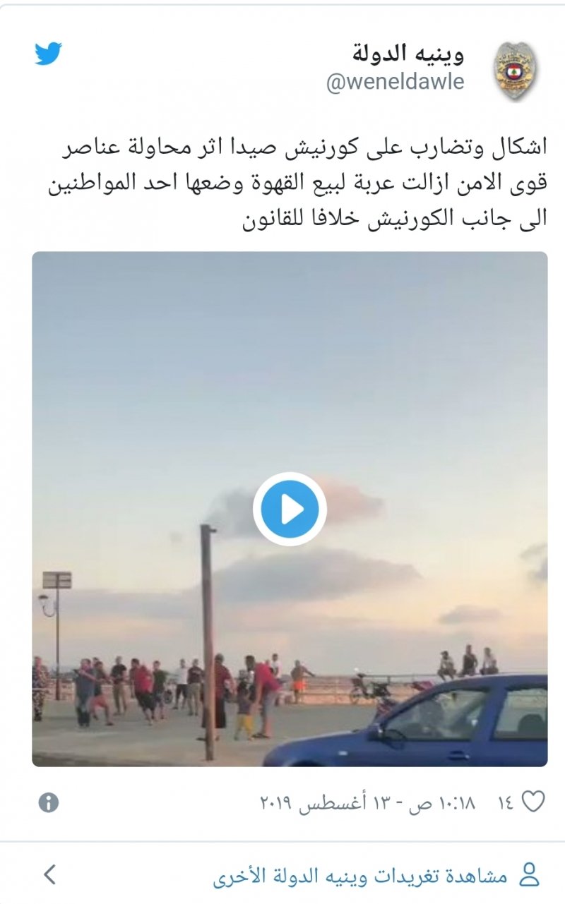 نشر حساب وينية الدولة على حسابه الرسمي على موقع التواصل الاجتماعي تويتر الخبر التالي : اشكال وتضارب على كورنيش صيدا اثر محاولة عناصر قوى الامن ازالت عربة لبيع القهوة وضعها احد المواطنين الى جانب الكورنيش خلافا للقانون