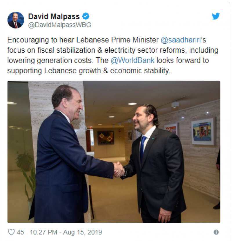 بعد لقائه رئيس مجلس الوزراء سعد الحريري أمس، غرّد رئيس البنك الدولي ديفيد مالباس في واشنطن على حسابه عبر "تويتر"، منوهاً بـ"الكلام المشجع الذي سمعه من الرئيس الحريري الذي ركز على الإستقرار المالي وإصلاح قطاع الكهرباء وخفض كلفة الإنتاج".