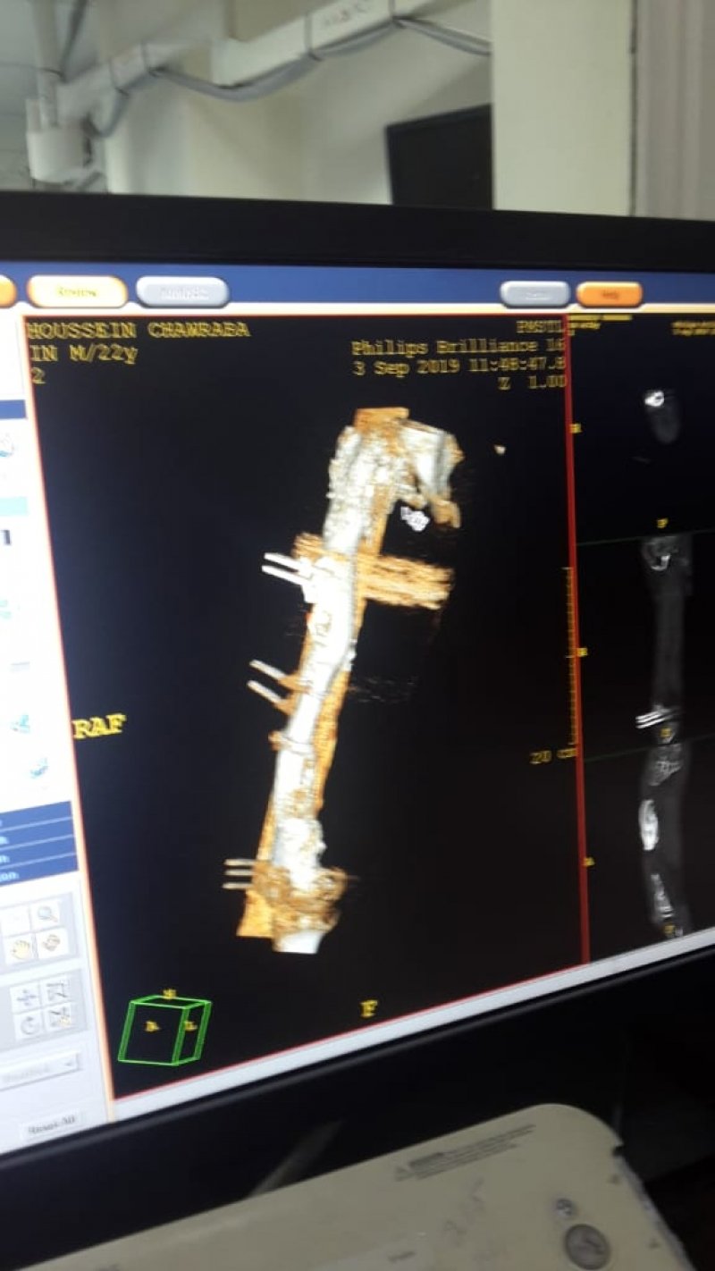 وكانت نهاية المشوار اليوم حيث تم نزع الجهاز المثبت في عملية أجريت في مستشفى تبنين الحكومي بعد أن تأكد البروفسور عبيد من متانة العظم وبالتالي بإمكان الشاب حسين مباشرة خطوته الأولى في طريق الالف ميل مشيا على قدميه.