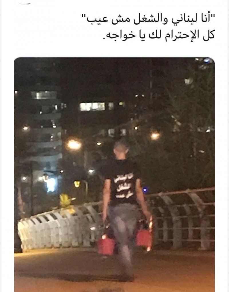 تداول ناشطون على مواقع التواصل الاجتماعي صورة لشاب يرتدي قميصاً أسود اللون كُتب عليه بالأبيض: “أنا لبناني والشغل مش عيب”.