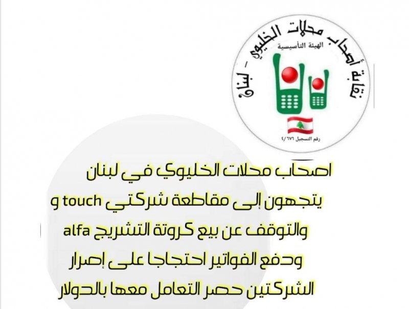أعلنت نقابة أصحاب محال الخليوي في لبنان في بيان وصلنا عن مقاطعتها لشركتي touch و Alfa وذلك بسبب إصرار الشركتين على إجراء كافة عمليات البيع والشراء بالدولار الامريكي والذي بدأ يشهد السوق اللبناني شح في توفره. وهذا نص البيان :