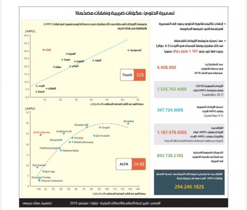 يبيّن تقرير لجنة الإعلام والاتصالات النيابية المقدّم في 16 أيلول/ سبتمبر أن كلفة الاتصالات الخلوية في لبنان هي من الأعلى في العالم، إذ تزيد أكثر من 4 أضعاف عن الكلفة المُترتبة على كلّ مشترك في الأردن الذي يتمتّع بخصائص مشابهة.