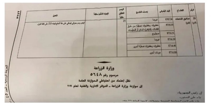 وفي ما يلي نص المرسوم وجداول البضائع التي تشملها الرسوم الإضافية: