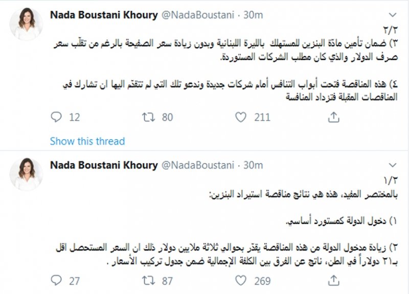 غرّدت وزيرة الطاقة والمياه في حكومة تصريف الاعمال ندى بستاني، عبر حسابها على "تويتر"، موضحة "بالمختصر المفيد" نتائج مناقصة استيراد البنزين.