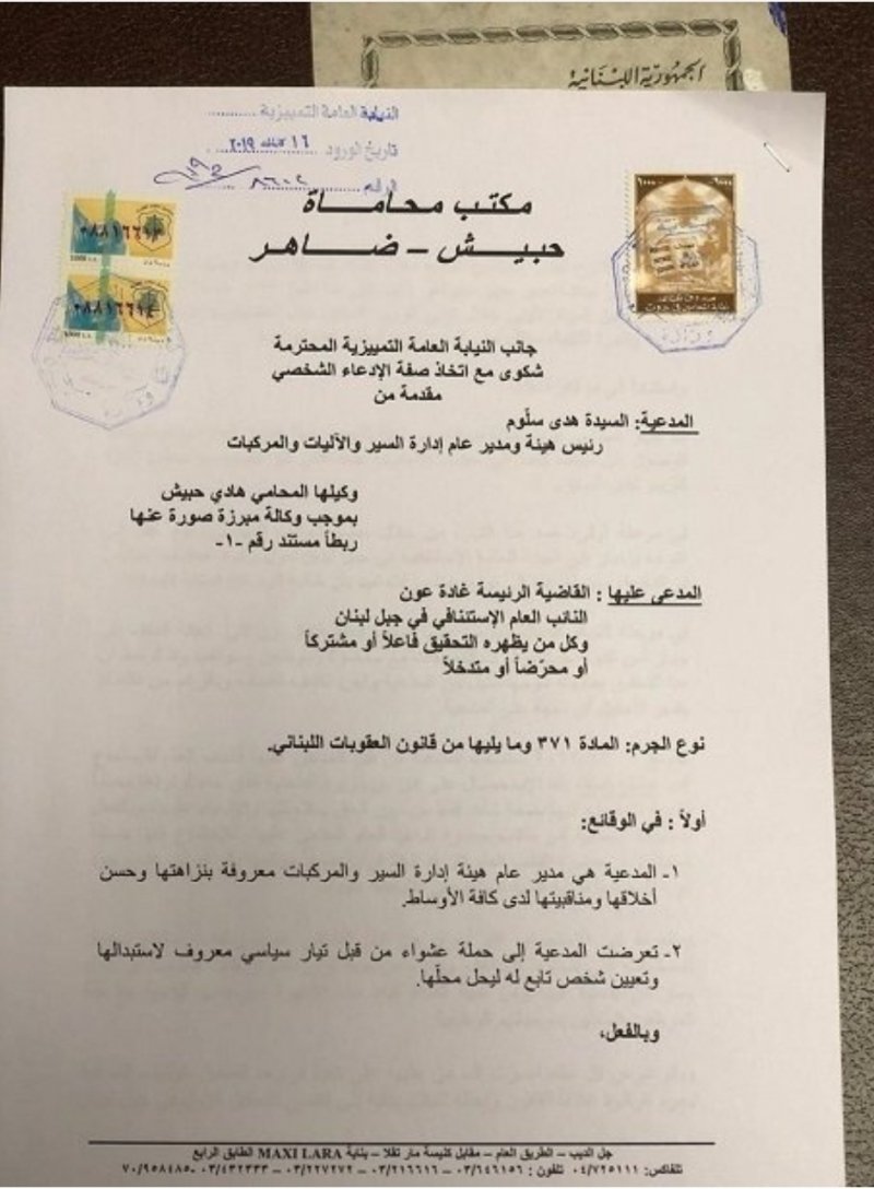 قدّمت رئيسة هيئة إدارة السير والمركبات هدى سلوم عبر موكلها المحامي النائب هادي حبيش بدعوى قضائية ضد النائب العام الاستئنافي في جبل لبنان القاضية غادة عون، وقد اتهمتها بسجنها لأنها تريد تعيين شخصية أخرى مكانها. وقد جاء في الدعوى ما يلي: