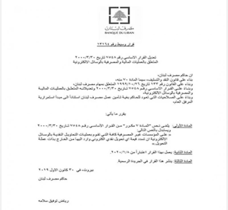 صدر عن مصرف لبنان قرار مهمّ يتعلّق بتعديل القرار الاساسي رقم 7548 المتعلّق بالعمليات المالية والمصرفية بالوسائل الالكترونية، إذ ألغى القرار نصّ “المادة 7 مكرّر” من القرار الاساسي وإستبدل النصّ بالاتي: