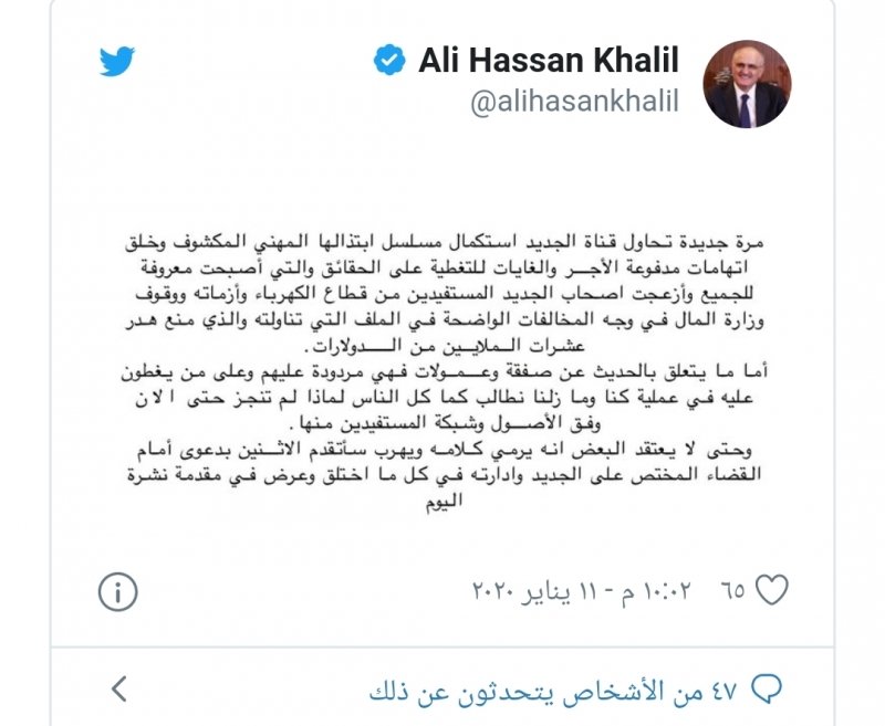 وتابع خليل، “وحتى لا يعتقد البعض انه يرمي كلامه ويهرب سأتقدم الاثنين بدعوى أمام القضاء المختص على الجديد وادارته في كل ما اختلق وعرض في مقدمة نشرة اليوم”.
