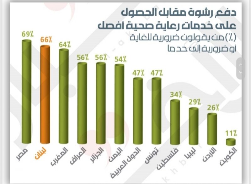 في مجال التعليم، 42% فقط قالوا إنّهم راضون عن النظام التعليمي في بلدانهم، و42% تحدثوا عن دفع رشوة للموظفين الحكوميين «للحصول على خدمات تعليمية أفضل». أما لبنان، فقد احتلّ المرتبة الأولى بين البلدان التي قالت شعوبها إنّه يجب دفع رشوة، فبلغت النسبة 63%، فيما سجّلت الكويت 13% وهي أدنى نسبة بين البلدان العربية. وبالنسبة إلى خدمات الرعاية الصحية، لا تزيد نسبة المواطنين الراضين عن هذه الخدمات في بلدانهم على الـ38%، «ويعتقد 47% على مستوى المنطقة أنّه من الضروري دفع رشوة للحصول على خدمات رعاية صحية أفضل». أيضاً، يُعدّ لبنان من بين أكثر الدول التي يُفترض فيها دفع رشوة لقاء الخدمة الصحية، فبلغت النسبة 66%، ليحتل المرتبة الثانية بعد مصر التي بلغت النسبة فيها 69%.