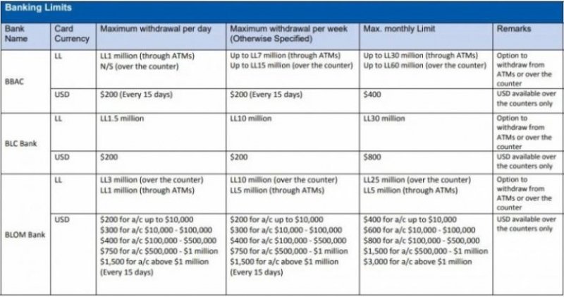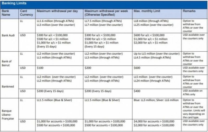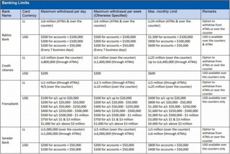 حددت المصارف اللبنانية سقفاً للمبالغ المالية التي يمكن للمودعين سحبها من داخل المصرف مباشرة ومن خلال الصراف الالي، في اليوم الواحد وفي الأسبوع وفي الشهر. وفي ما يلي بحسب ما نشرت “اللواء”، تظهر المبالغ التي حددت من قبل كل مصرف: