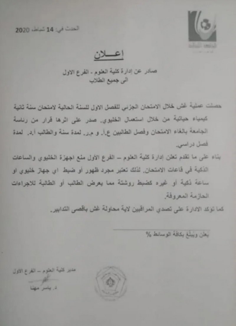 ﺃﺻﺪﺭﺕ ﺍﺩﺍﺭﺓ ﻛﻠﻴﻪ ﺍﻟﻌﻠﻮﻡ ﻓﻲ ﺍﻟﺠﺎﻣﻌﺔ ﺍﻟﻠﺒﻨﺎﻧﻴﺔ – ﺍﻟﻔﺮﻉ ﺍﻻﻭﻝ ﻗﺮﺍﺭ ﺑﻔﺼﻞ ﺍﻟﻄﺎﻟﺒﻴﻦ ﻉ . ﺃ ﻭﻡ . ﺭ ﻟﻤﺪﺓ ﺳﻨﺔ ﻭﺍﻟﻄﺎﻟﺐ ﺃ . ﺩ ﻟﻤﺪﺓ ﻓﺼﻞ ﺩﺭﺍﺳﻲ ﻭﻫﻢ ﻓﻲ ﺍﻟﺴﻨﺔ ﺍﻟﺪﺭﺍﺳﻴﺔ ﺍﻟﺜﺎﻧﻴﺔ – ﻛﻴﻤﻴﺎﺀ ﺣﻴﺎﺗﻴﺔ ﻭﺫﻟﻚ ﻋﻠﻰ ﺧﻠﻔﻴﺔ ﻋﻤﻠﻴﺔ ﻏﺶ ﻓﻲ ﺍﻻﻣﺘﺤﺎﻥ ﺍﻟﺠﺰﺋﻲ ﻟﻠﻔﺼﻞ ﺍﻻﻭﻝ ﻟﻠﺴﻨﺔ ﺍﻟﺤﺎﻟﻴﺔ ﻣﻦ ﺧﻼﻝ ﺍﺳﺘﻌﻤﺎﻝ ﻫﺎﺗﻒ ﺧﻠﻴﻮﻱ .