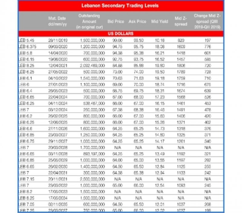 4.5 مليار دولار أميركي قيمة إستحقاقات سندات اليوروبوندز في العام 2020. و3.9 مليار دولار في العام 2021، و3.7 في العام 2022، و3.1 في العام 2023... لإجمالي دين عام بالعملة الأجنبية يوازي الـ 33 مليار دولار أميركي منها 28.3 مليار دولار أميركي سندات يوروبوندز.