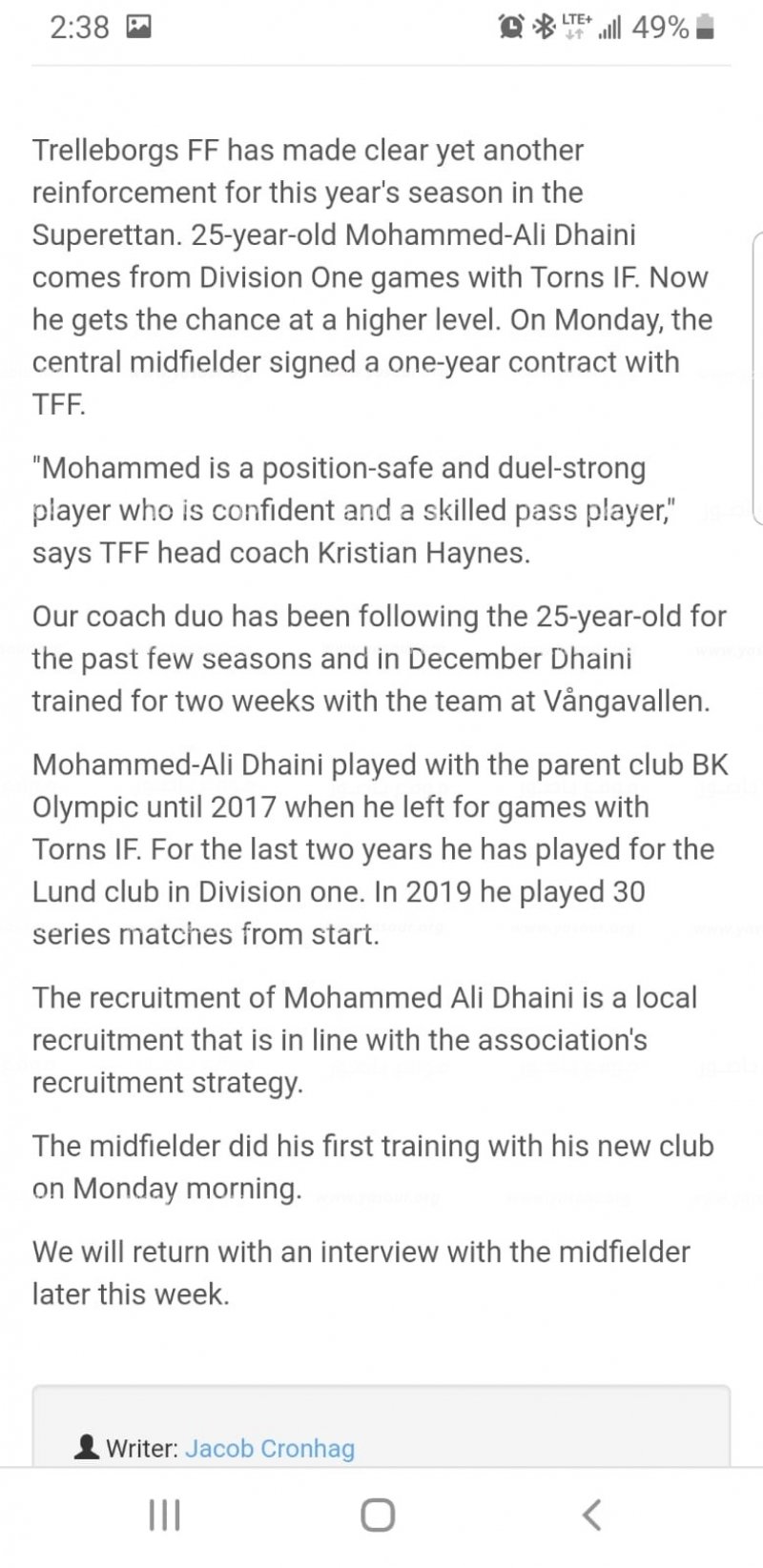 نشرت صفحة الفيسبوك الرسمية التابعة لفريق Trelleborgs-FF السويدي خبر توقيع اللاعب اللبناني محمد علي دهيني (25 سنة، من بلدة جباع الجنوبية) عقد احتراف مع الفريق بعد أدائه المميز في الموسم الماضي في الدرجة الأولى. دهيني الذي سيكون لاعب خط الوسط للفريق، سيمثل فريقه في الدوري السويدي Superettan gلموسم الرياضي الجديد الذي سينطلق في شهر نيسان.