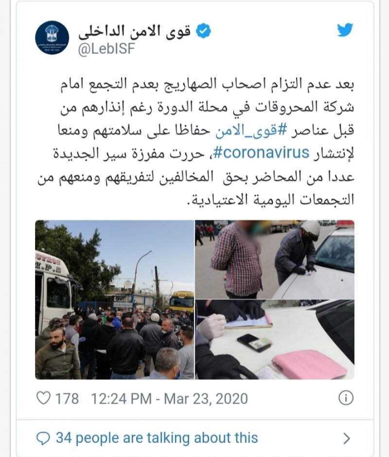 أعلنت قوى الأمن الداخلي في تغريدة على حسابها عبر "تويتر"، أنه "بعد عدم التزام اصحاب الصهاريج بعدم التجمع أمام شركة المحروقات في محلة الدورة رغم إنذارهم من قبل عناصر قوى الأمن حفاظا على سلامتهم ومنعا لإنتشار فيروس كورونا، حررت مفرزة سير الجديدة عددا من المحاضر بحق المخالفين لتفريقهم ومنعهم من التجمعات اليومية الاعتيادية".