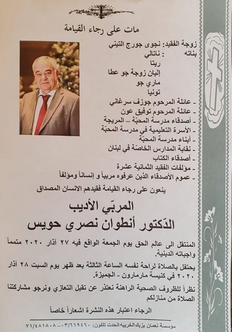 لن نتمكن من وداعك كما يليق بك، ولن تتمكن أرض المحبة وأبناء المحبة من احتضانك للمرة الأخيرة. سيحتفل بالصلاة لراحة نفسه غداً السبت في كنيسة مار مارون في الجميزة ولكن العائلة طلبت المواساة من المنازل بسبب الظروف الصحية الراهنة.