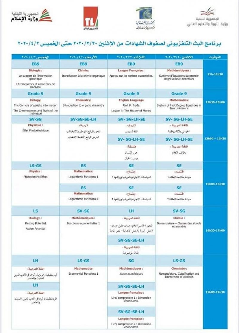 أعلنت وزارة التربية والتعليم العالي، بالتعاون مع وزارة الإعلام والمركز التربوي للبحوث والإنماء، في بيان، “بدء البث التلفزيوني لصفوف الشهادات اليوم، عبر أثير تلفزيون لبنان وفق البرنامج المرفق”.