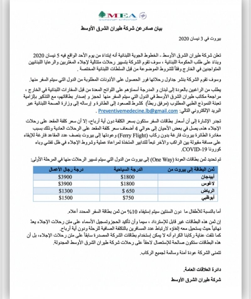 على صفحتها الرسمية على فايسبوك اعلنت شركة طيران الشرق الاوسط عن اسعار بطاقات السفر لاجلاء المغتربين اللبنانين، وفيما ظهر واضحاً ان اسعار البطاقات مرتفعة كثيراً عن سعرها العادي، بررت الميدل ايست الاسعار المرتفعة بأن الطائرات ستذهب فارغة من لبنان وتعود بنصف مقاعدها فارغة للابقاء على مسافات امنة بين الركاب.