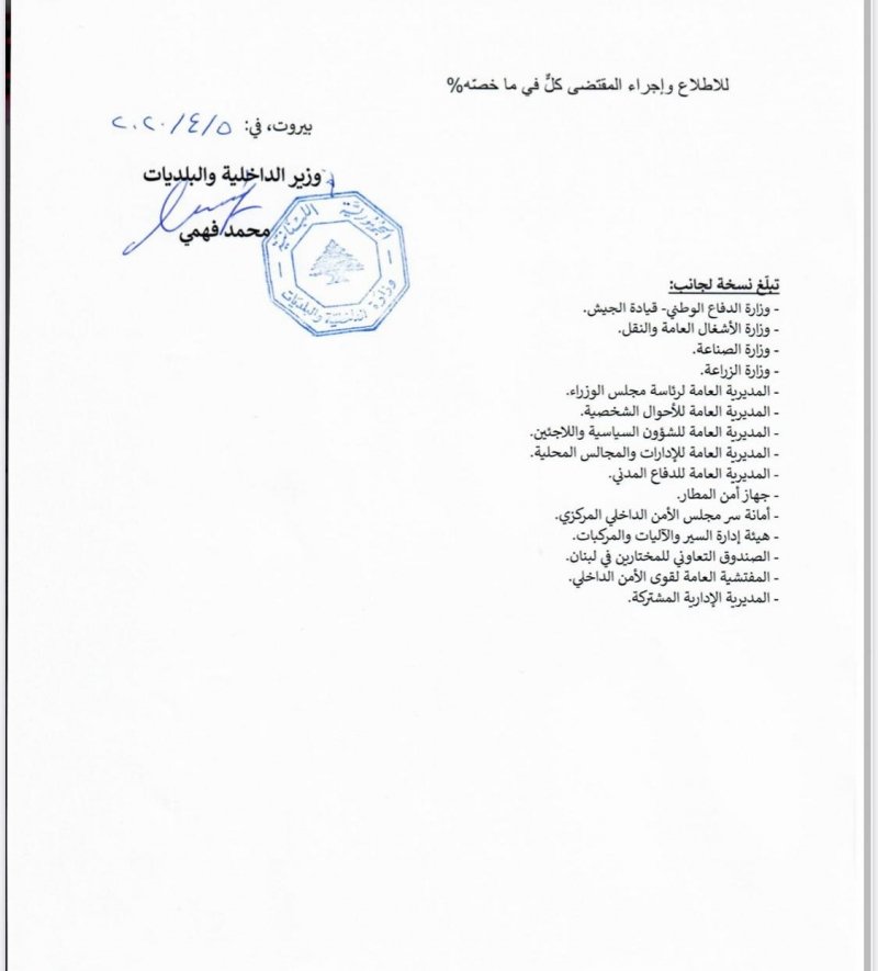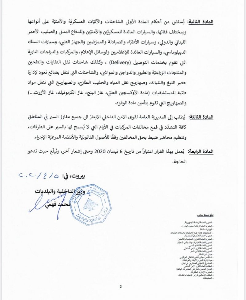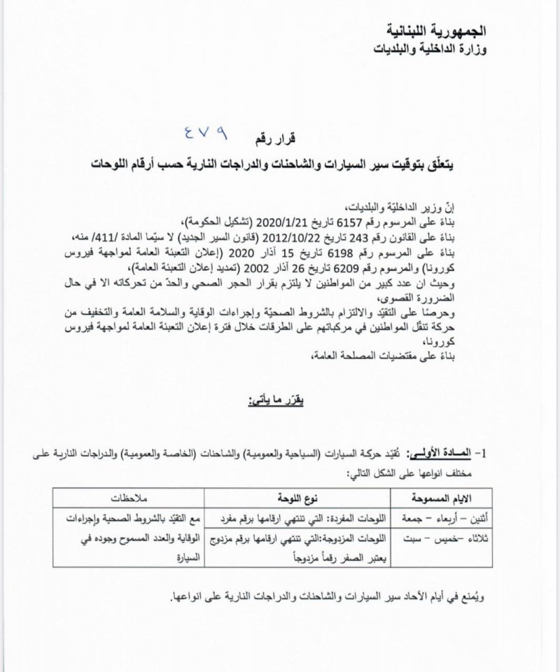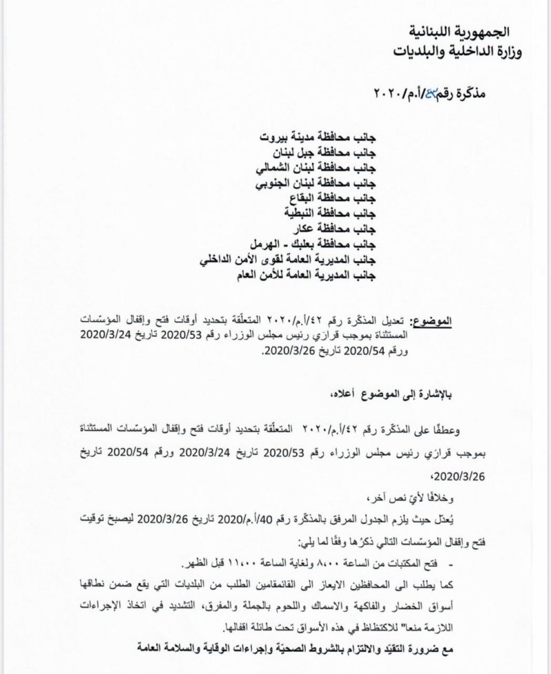 أصدرت وزارة الداخلية مذكرة جديدة بتعديل المذكرة رقم 42 أ.م. 2020 المتعلقة بتحديد أوقات فتح واقفال المؤسسات المستثناة في اطار قرار التعبئة العامة والتي تقيد حركة السيارات والشاحنات بحسب أرقام اللوحات.