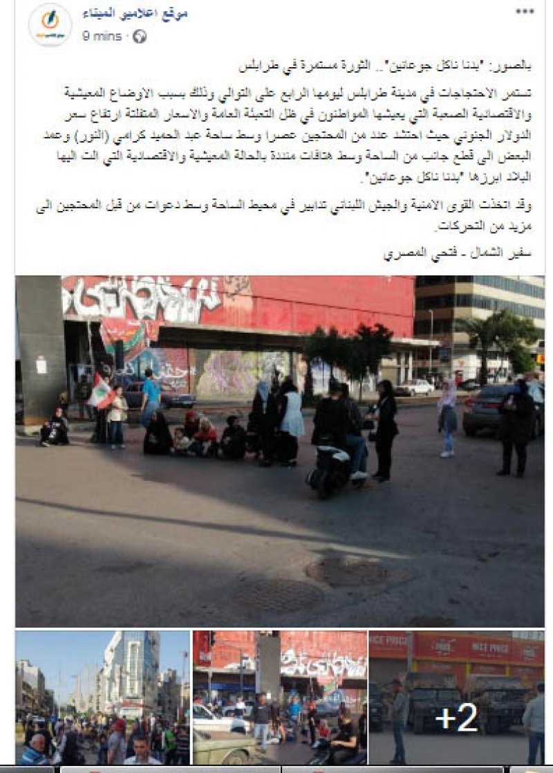 نشر "اعلاميو الميناء" نقلا عن "سفير الشمال" صوراً للتحركاكات الاحتجاجية في مدينة طرابلس ليومها الرابع على التوالي وذلك بسبب الاوضاع المعيشية والاقتصادية الصعبة التي يعيشها المواطنون في ظل التعبئة العامة والاسعار المتفلتة وارتفاع سعر الدولار الجنوني حيث احتشد عدد من المحتجين عصرا وسط ساحة عبد الحميد كرامي (النور) وعمد البعض الى قطع جانب من الساحة وسط هتافات منددة بالحالة المعيشية والاقتصادية التي الت اليها البلاد ابرزها ″بدنا ناكل جوعانين″.