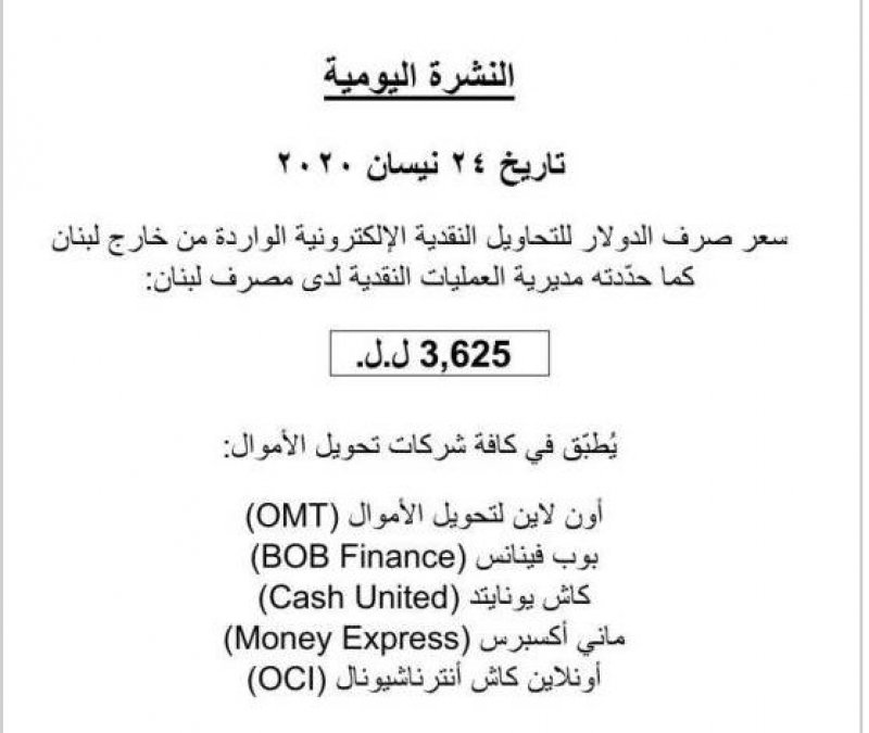 ويُطبّق هذا السعر في شركات تحويل الأموال كافة: "أون لاين لتحويل الأموال (OMT)، بوب فينانس (BOB Finance)، كاش يونايتد (Cash United)، ماني أكسبرس (Money Express)، وأونلاين كاش أنترناشيونال (OCI)".