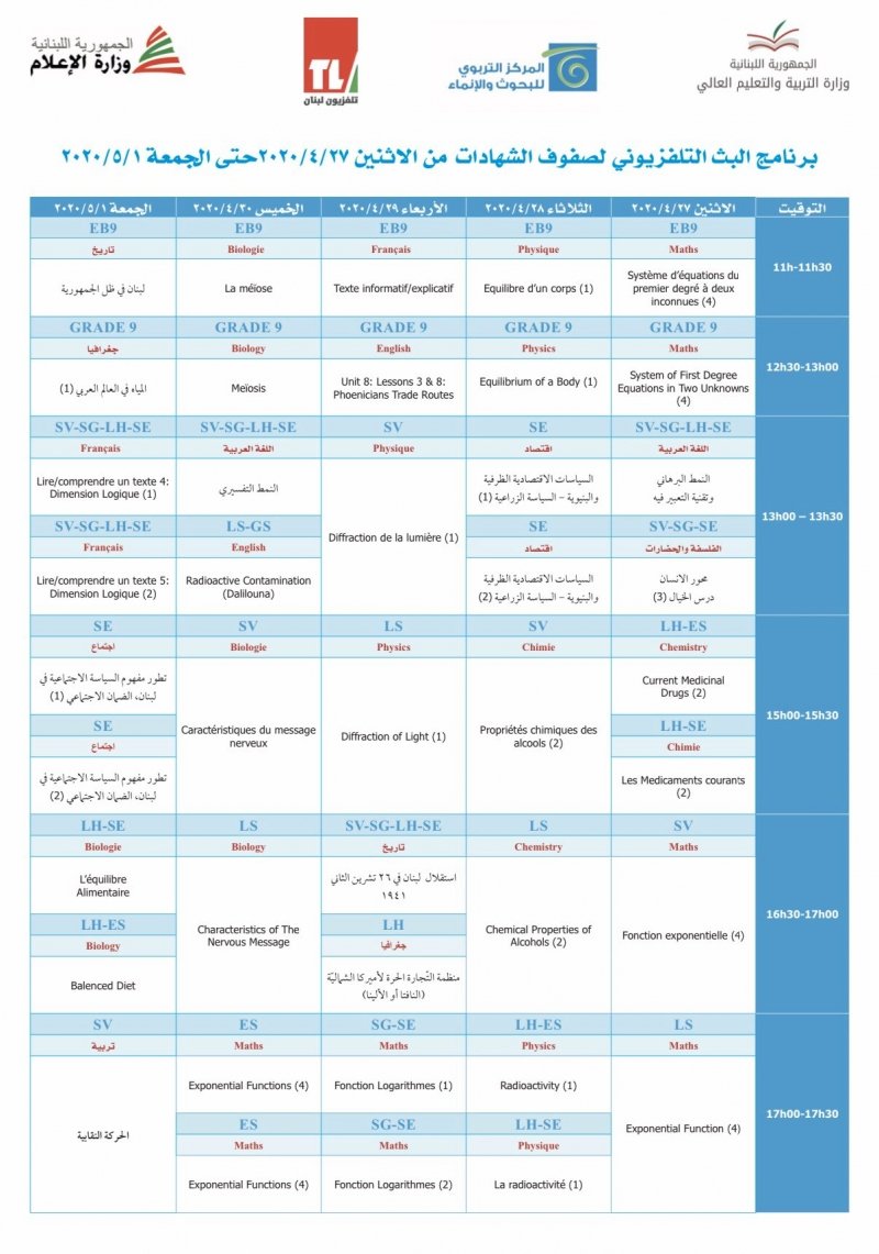 نشر وزير التربية والتعليم العالي طارق المجذوب على حسابه عبر "تويتر"، جدول برنامج البث التلفزيوني لصفوف الشهادات من الإثنين 27/4/2020 حتى الجمعة 1/5/2020.