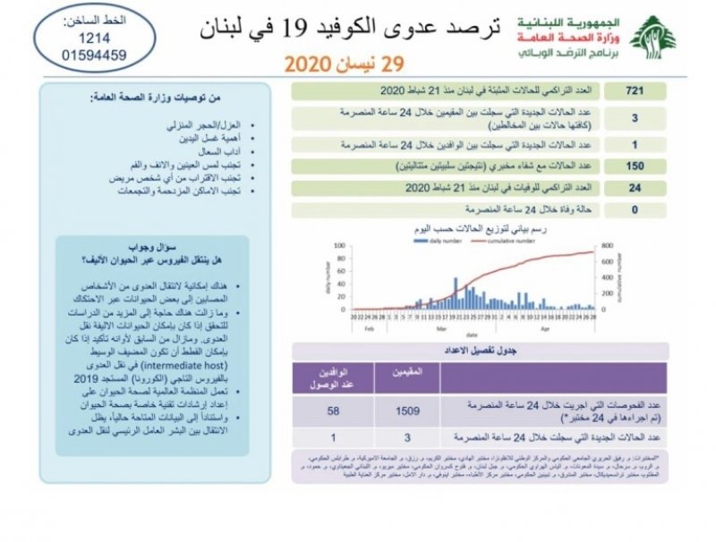 اعلنت وزارة الصحة العامة تسجيل 4 حالات كورونا جديدة رفعت عدد المصابين الى 721.