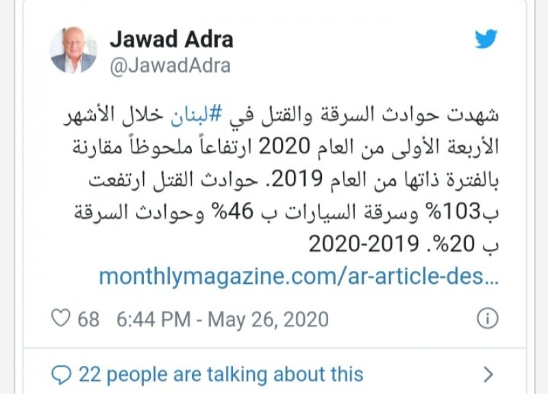 وبحسب ما نشر رئيس الدولية للمعلومات جواد عدرا في تغريدة على حسابه عبر "تويتر"، "ارتفعت حوادث القتل بـ 103% وسرقة السيارات بـ 46% وحوادث السرقة بـ 20%".